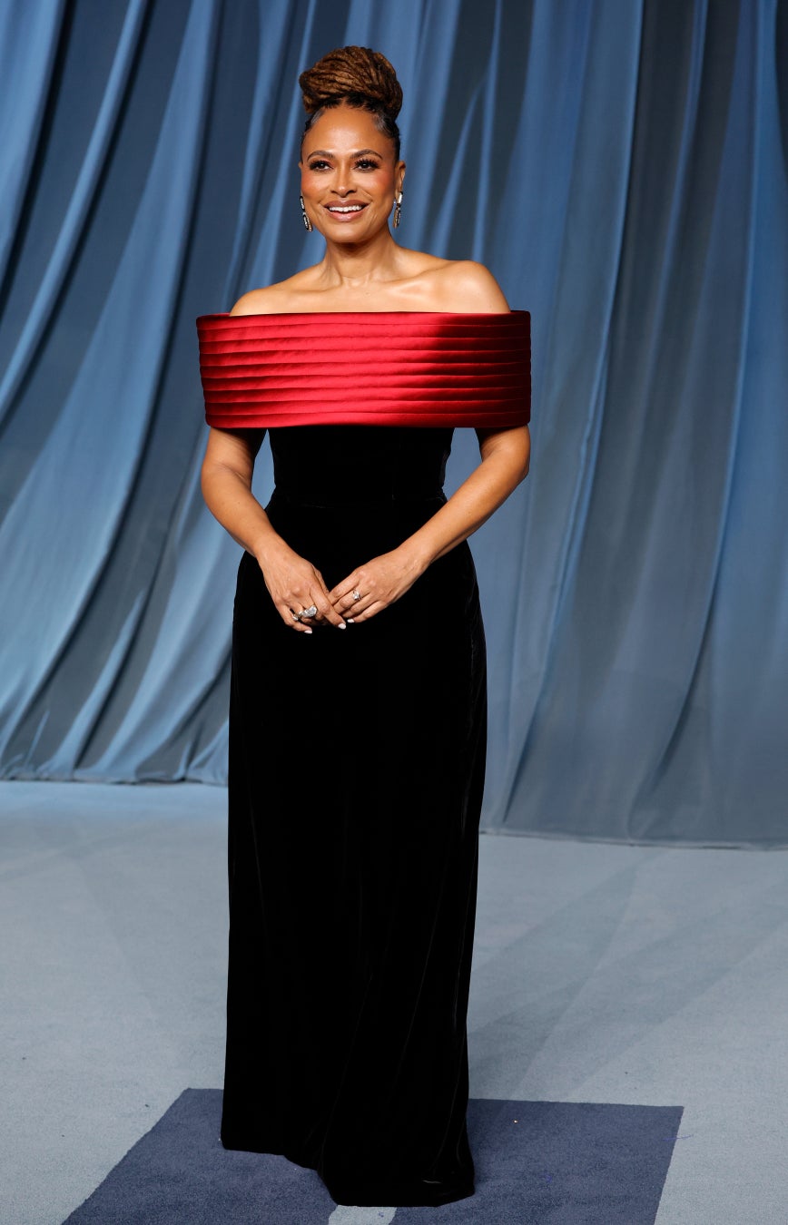 エイヴァ·デュヴァーネイは、バーガンディのサテンネックラインがあしらわれた、ブラックベルベットのオフショルダー コラムドレスを纏いました。