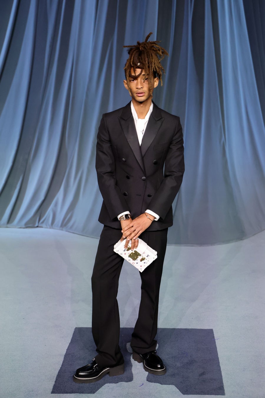 ジェイデン·スミスは、ブラックのダブルブレスト タキシードに「LV ナイト ラバリエールブラウス」、ブラックのシューズ「LV ボブール ローファー」と、ホワイトのバッグ「プティット·マル」を合わせました。