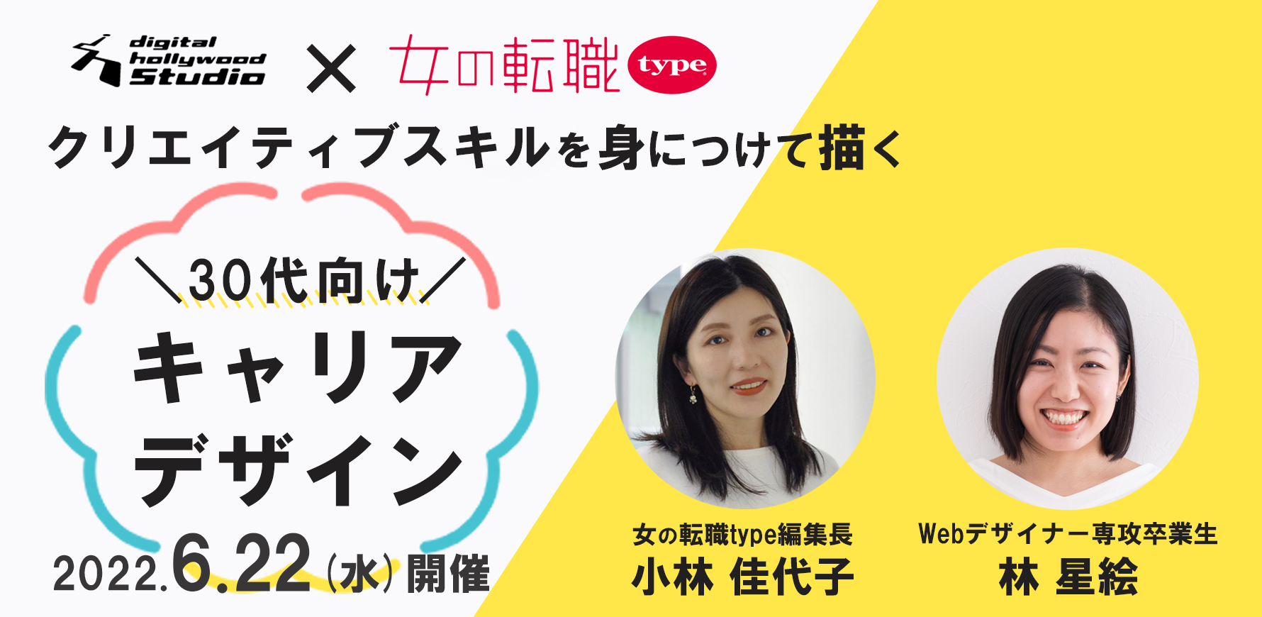 IT 関連及びデジタルコンテンツの人材育成スクール、デジタルハリウッド(運営会社:デジタルハリウッド株式会社 本社/本校:東京都千代田区 学長:杉山知之)が運営をする、新しい学びのスタイルを通して多様なライフスタイルを支援し全国へ展開している、Web と動画について学べるラーニングスタジオ『デジタルハリウッドSTUDIO』では、株式会社キャリアデザインセンター(本社:東京都港区 代表取締役社長兼会長:多田 弘實)が運営する、女性の転職に特化した転職サイト『女の転職type』と共に、20代~30代の女性のキャリアを応援するイベント、「クリエイティブスキルを身につけて描く30代向けキャリアデザイン」を6月22日(水)に開催します。