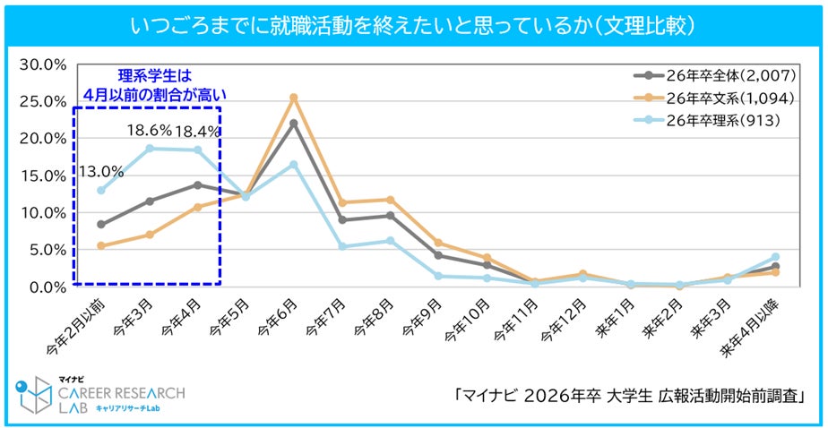 就職活動を終えたい時期は経年で前倒しの傾向にあるものの、ピークは変わらず「6月(22.0%、前年比3.8pt減)」である。3月1日から本格的に就職活動が開始されるが、内々定を得たとしても、多くの学生が6月までは就職活動を継続することが予想される。文理別にみると、理系学生は早く終えたいと考えている学生が多く、文系学生と比較すると特に4月以前の割合が多い。人によって就職活動を終了したい時期にも差があるため、周囲の状況に振り回されることなく、自分のペースで就職活動を進めることが重要だ。【図9、10】