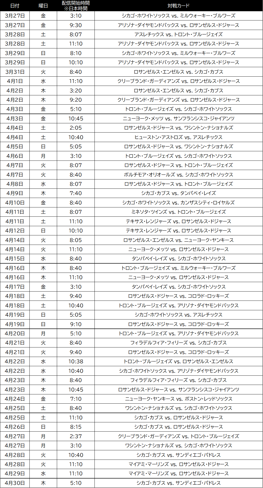 また、3月31日(火)のロサンゼルス・エンゼルス対シカゴ・カブスでは菊池雄星選手・鈴木誠也選手・今永昇太選手らの日本人選手の活躍に注目が集まります。さらに、昨シーズンのワールドシリーズの再戦となるロサンゼルス・ドジャース対トロント・ブルージェイズの試合を、4月7日(火)と4月8日(水)にて配信します。