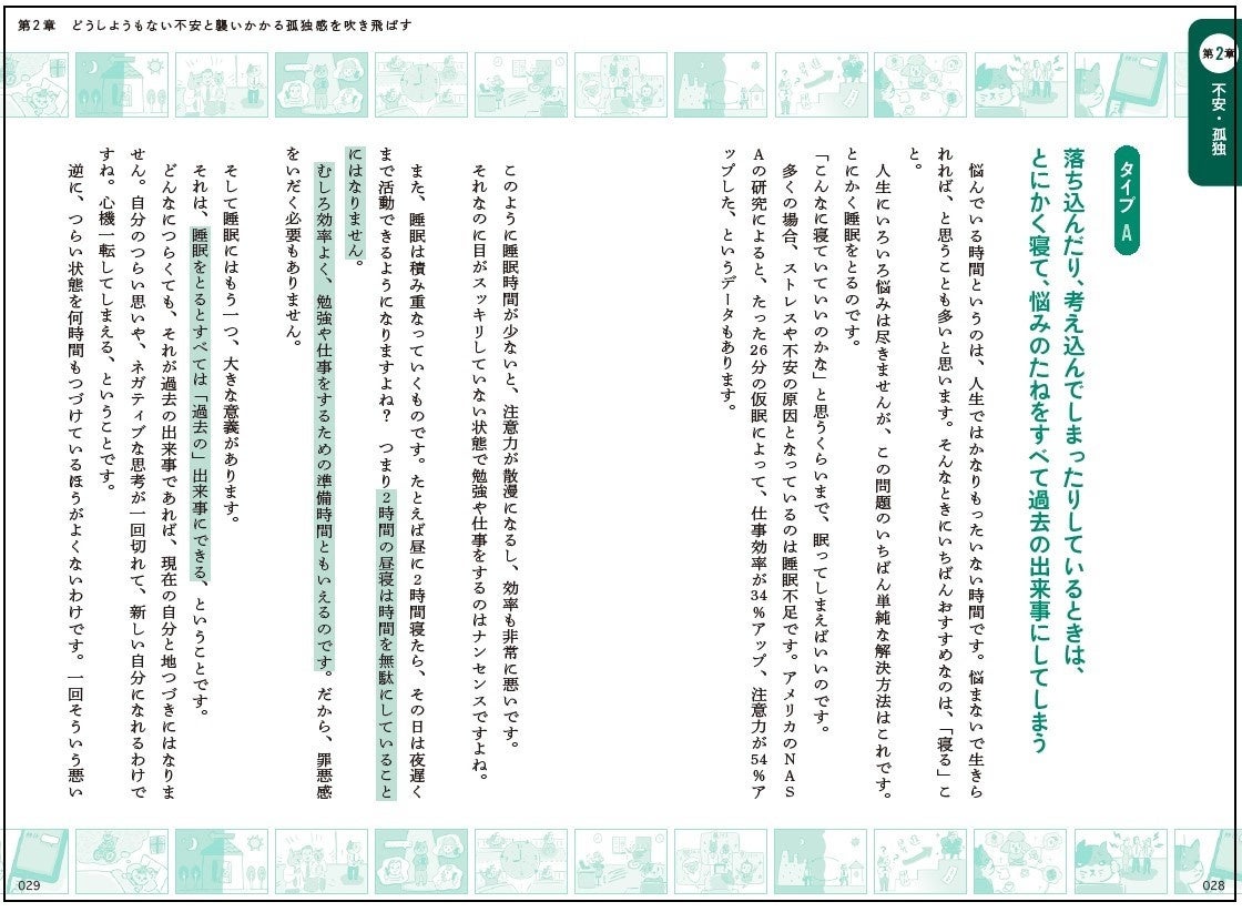 各お悩みには家族、友人、仕事、プライベートとカテゴリー別にシチュエーションイラストを掲載。自分の日常に当てはめやすいように構成しています。