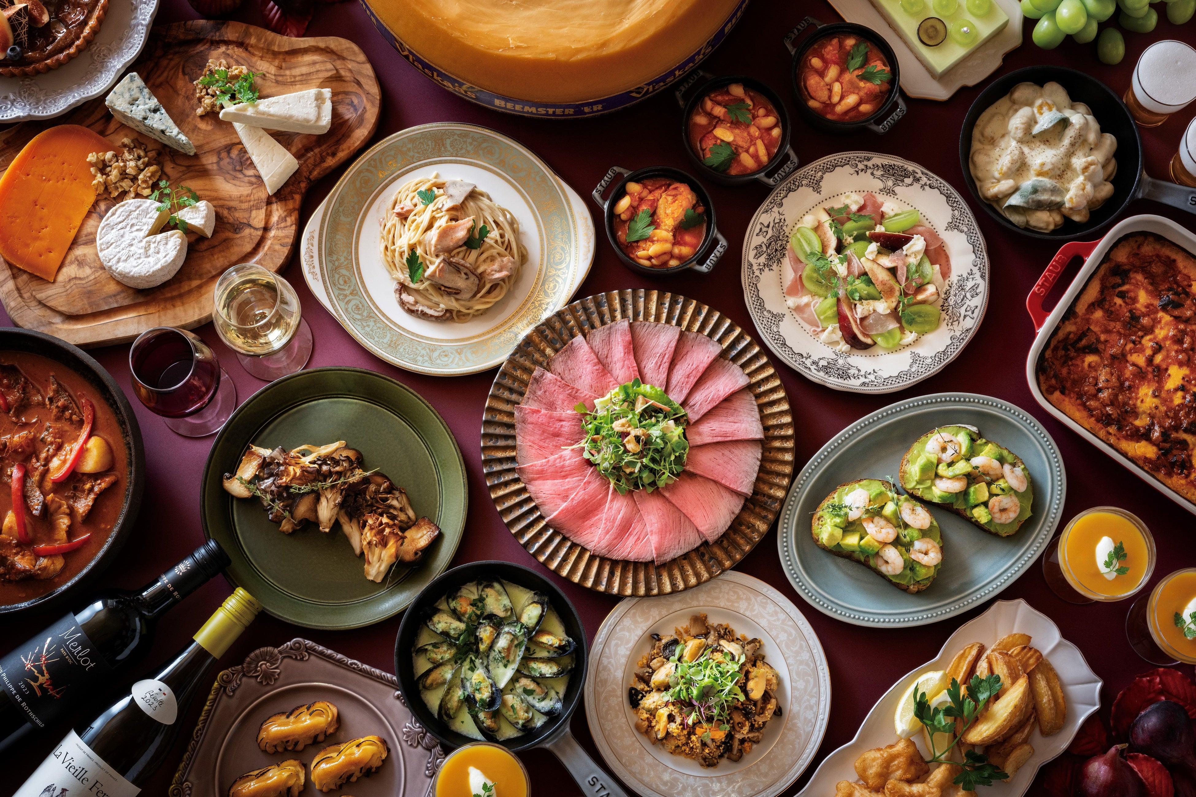 種類豊富な全28種の料理と生ビールやワインのフリードリンクで贅沢な夜を。フランス・アルザス地方の薄焼きピザ「タルトフランベ」や、イタリア・トスカーナ地方の「トリッパのトマト煮込み」、ハンガリー風パプリカ煮込み「真鱈のオングロワ」など、ヨーロッパ各地の伝統料理をご用意します。バターナッツかぼちゃを使用した、フランスのなめらかなクリームスープ「ブルーテ」や、「淡路産牛ミンチと秋茄子のギリシャ風グラタン」など、秋の味覚をふんだんに取り入れたメニューも。お好みのドリンクとペアリングしながら、五感で味わう旅をお楽しみください。