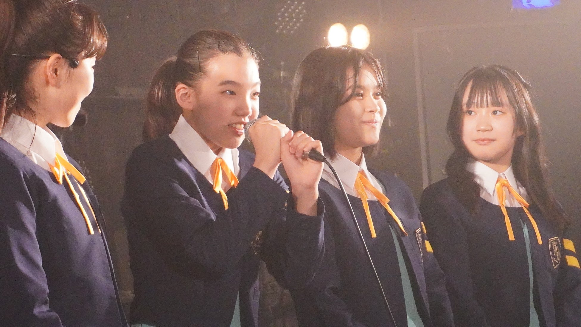 そして、昨年末より行なわれていた5期生募集オーディションで見事合格し、4月に発表された新メンバーの3名がステージに登場し、初お披露目となりライブの締めくくりとして、わたなべ おとは、みつふじ まりん、おおた めいが挨拶しました。