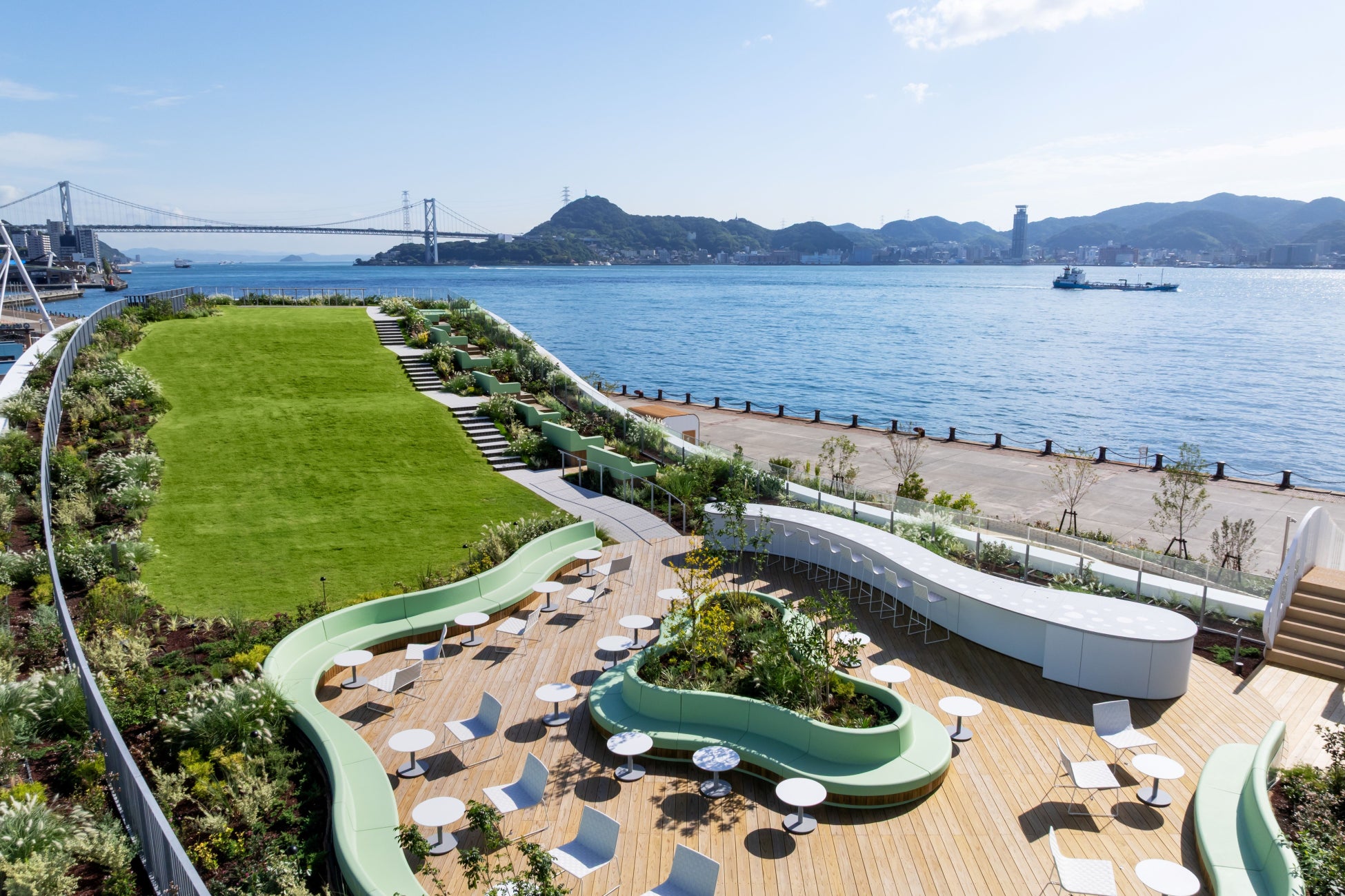 リゾナーレ下関は、関門海峡の景色や「ふぐ」など、この地域ならではの要素を随所に取り入れた建築デザインが特徴です。客室は、すべての部屋から関門海峡の景色を楽しめます。どの客室も、壁やインテリアは関門海峡の海の色から着想を得たエメラルドグリーンを基調とし、関門海峡の景色になじむデザインです。「なみなみテラス」は、先端にいくほど傾斜が強くなる、波のようなデザインが特徴です。芝生エリアや、寝そべってくつろげるソファ、カウンター席を設え、時間によって表情を変える関門海峡の景色を楽しめます。「ふぐビーチ」は、砂浜のように砂が敷き詰められ、子どもがはねて遊べる「ふわふわドーム」やソファ、植栽をふぐの柄のように設えています。ふぐをモチーフにした大胆で遊び心のあるデザインが特徴の「ふぐプール」の全天候型屋内プールは、子供のプールデビューにも最適です。