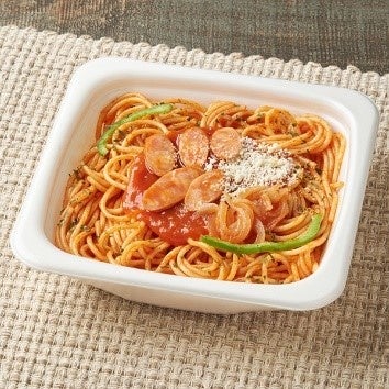 【内容】旨味と甘味が特徴の完熟トマト仕立てのナポリタンです。香ばしく炒めた麺に、ウインナー、玉ねぎ、ピーマン、粉チーズ、パセリ粉をトッピングしました。