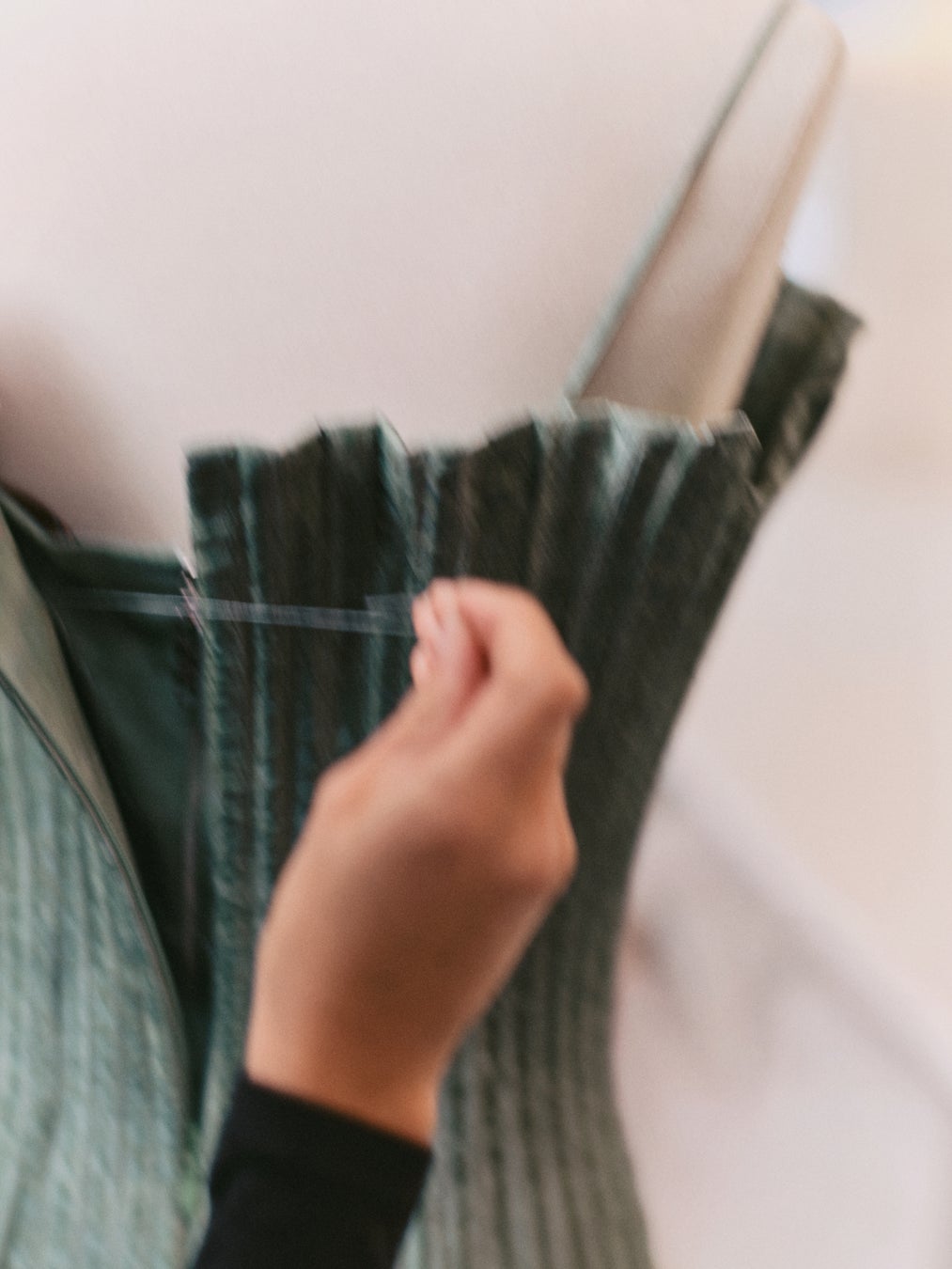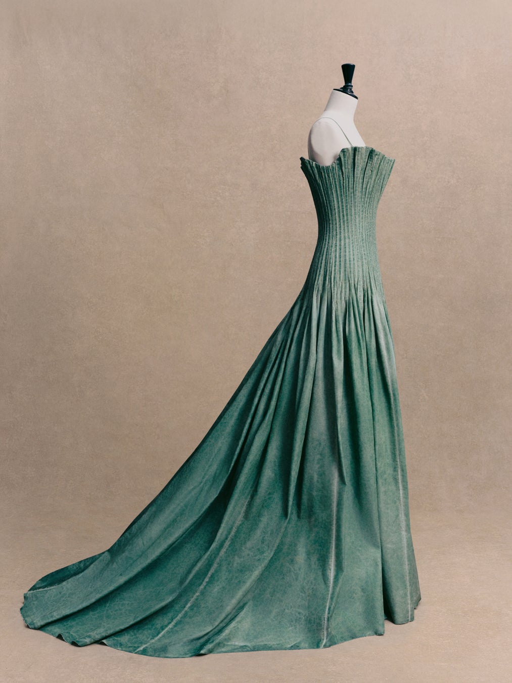 ヒップから下はプリーツが広がりながら裾に向かい、豊かなボリュームと後方に長く引きずるトレーンを生み出し、製品染め技法により、不均一で手描きのような質感が生まれ、通常はハリのあるタフタに柔らかさが加えられています。このドレスの制作には20メートル以上のシルクタフタが使用され、完成には約450時間以上を要しました。
