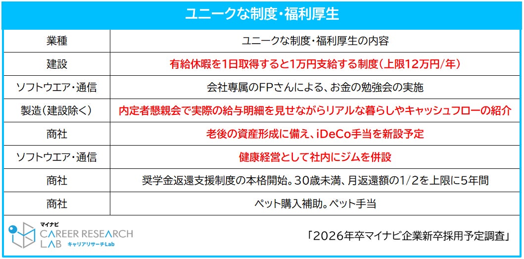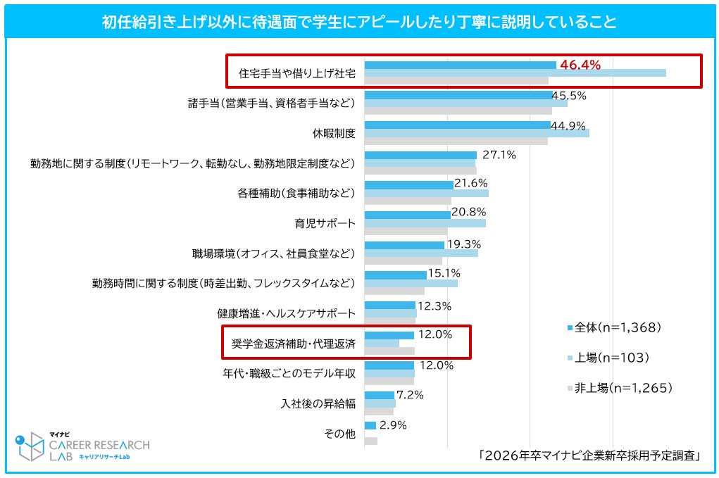 初任給引き上げ以外に「住宅手当・借り上げ社宅」「休暇制度」「奨学金返済支援」など、諸手当や制度をアピールする企業が多数。手当の新設など、「第三の賃上げ」を行う企業も