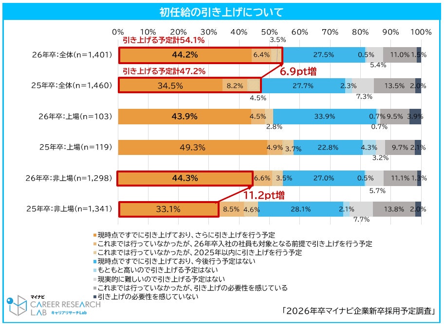 初任給の引き上げ予定がある企業は54.1%で前年比6.9pt増