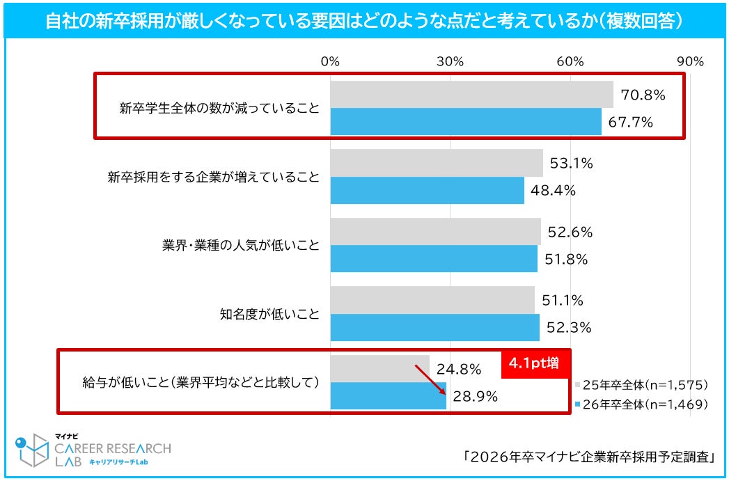 自社の採用が厳しくなる要因として「給与が低いこと」を挙げる企業が増加