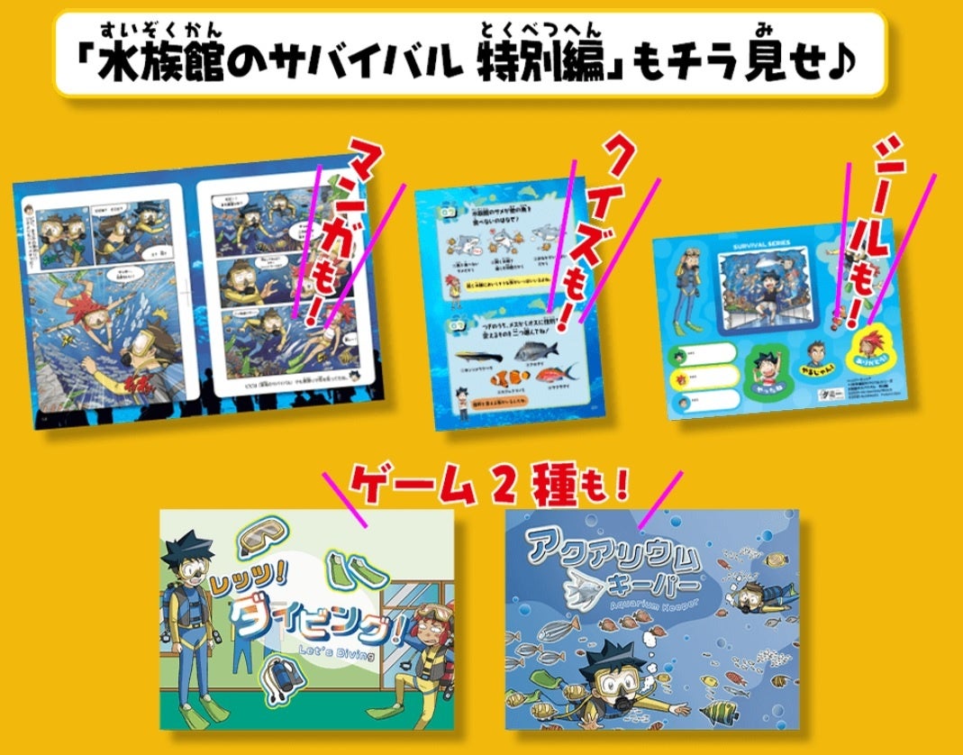 今回発売が発表されたハッピーセット®「水族館のサバイバル 特別編」は、シリーズで人気の『水族館のサバイバル』を特別編集したミニ書籍です。前回同様、マンガだけではなく、オリジナルのクイズや、スマートフォンで遊べるゲーム2種に、人気キャラクターのシールと盛りだくさんな内容となっています。