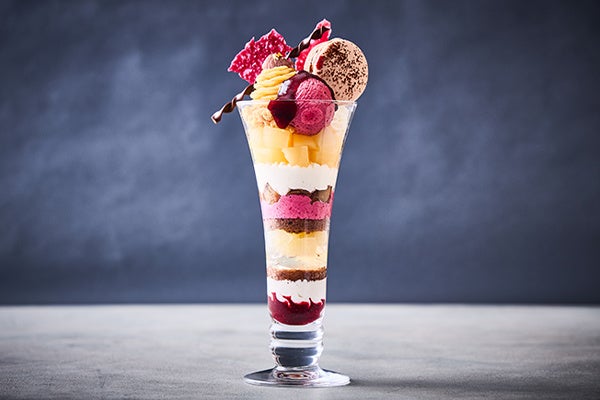 洋梨はフレッシュやコンポート、ゼリー、茨城県産笠間の栗は渋皮煮やババロワ、クリームにして重ね、食感や味わい、風味を変えて最後まで楽しく食べ進めることができるように仕上げました。アクセントにカシスを用い、ソースやシャーベット、レース状の薄いクッキーにして取り入れることで甘酸っぱさも加えました。軽くふんわりとした食感が特徴のビスキュイショコラを間に挟むことで全体を調和させ、さらにトップにマカロンショコラを飾り華やかさもプラスした、美しいビジュアルと大人な味わいのパフェをご賞味ください。