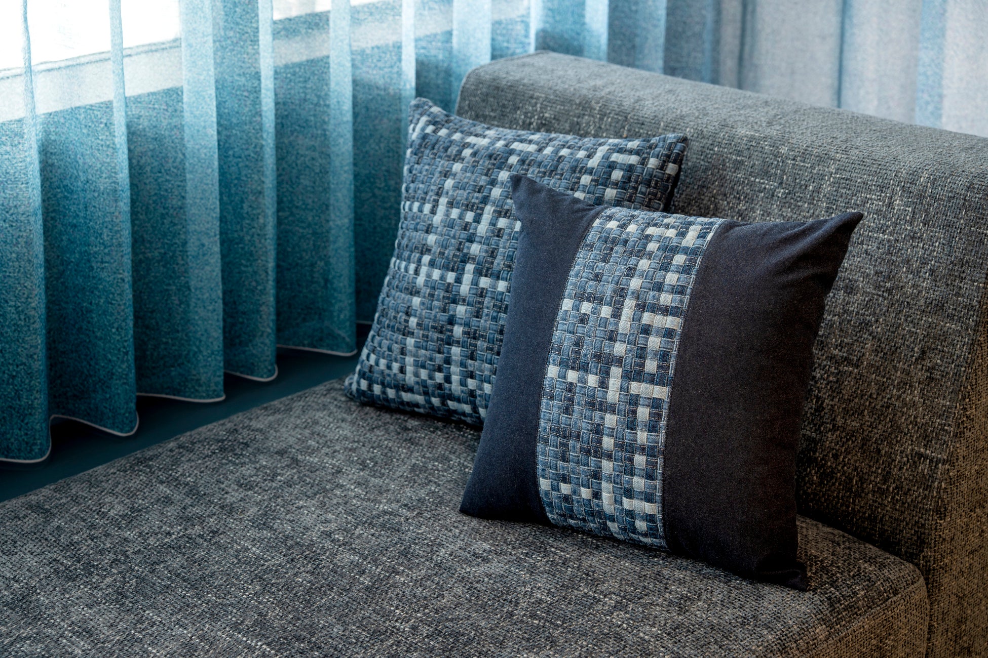 ご当地部屋「海霧の間」からは、穏やかな瀬戸内海と島々が織りなす多島美を望むことができます。窓の両側を彩るカーテンは、幻想的な海霧をイメージしたデザイン。瀬戸内の島々が柔らかなグラデーションで描かれ、窓の外に広がる本物の景色と客室がシームレスにつながる一体感を演出します。室内には、広島県福山市を中心とする備後地域で生まれた高品質な「福山デニム」のクッションや、香川県の高級石材・庵治石(あじいし)の粉を練り込んだ「庵治ガラス」の照明を設えました。瀬戸内が誇る、いくつもの工芸品が調和し、地域の文化を肌で感じる上質な空間に仕上げています。
