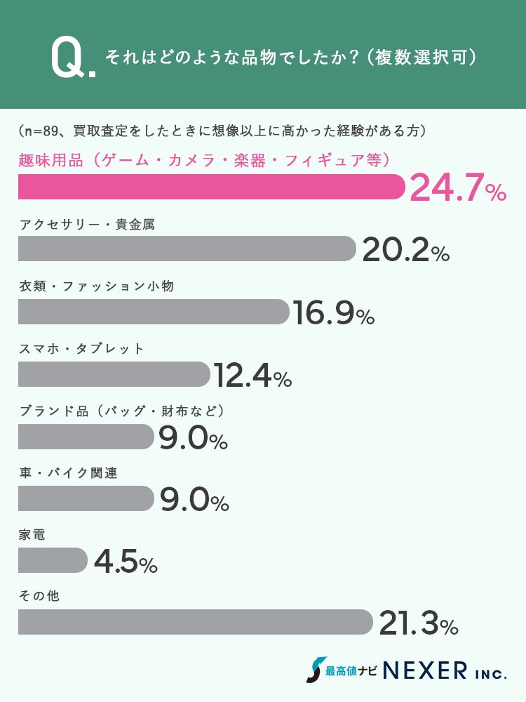 想像以上に高額だった品物として最も多かったのは「趣味用品」で24.7%でした。