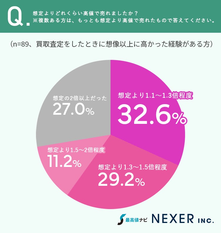 想定より高く売れた金額としては「1.1~1.3倍」「1.3~1.5倍」が多い一方、「2倍以上だった」人も27%と一定数いました。