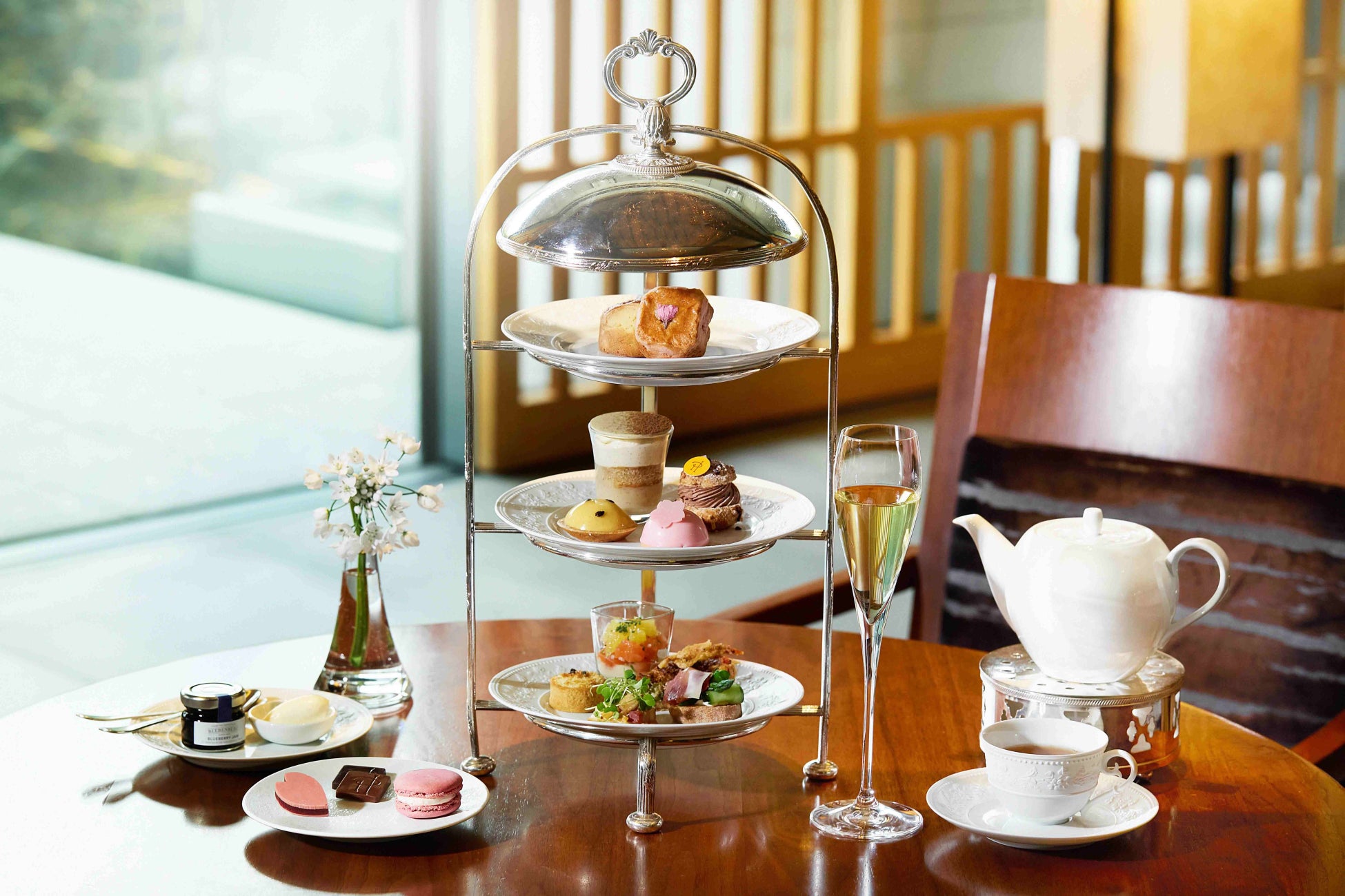 ピエール・エルメ・パリが手掛けるアフタヌーンティーでは、桜の花のフレーバーを表現した「ジャルダン ジャポネ」のケーキをご堪能いただけます。トンカ豆、レモン、グリオットチェリーが織りなす絶妙なハーモニーが春の訪れを感じさせます。桜の風味が香る特製スコーンとともに、優雅なひとときをお楽しみください。