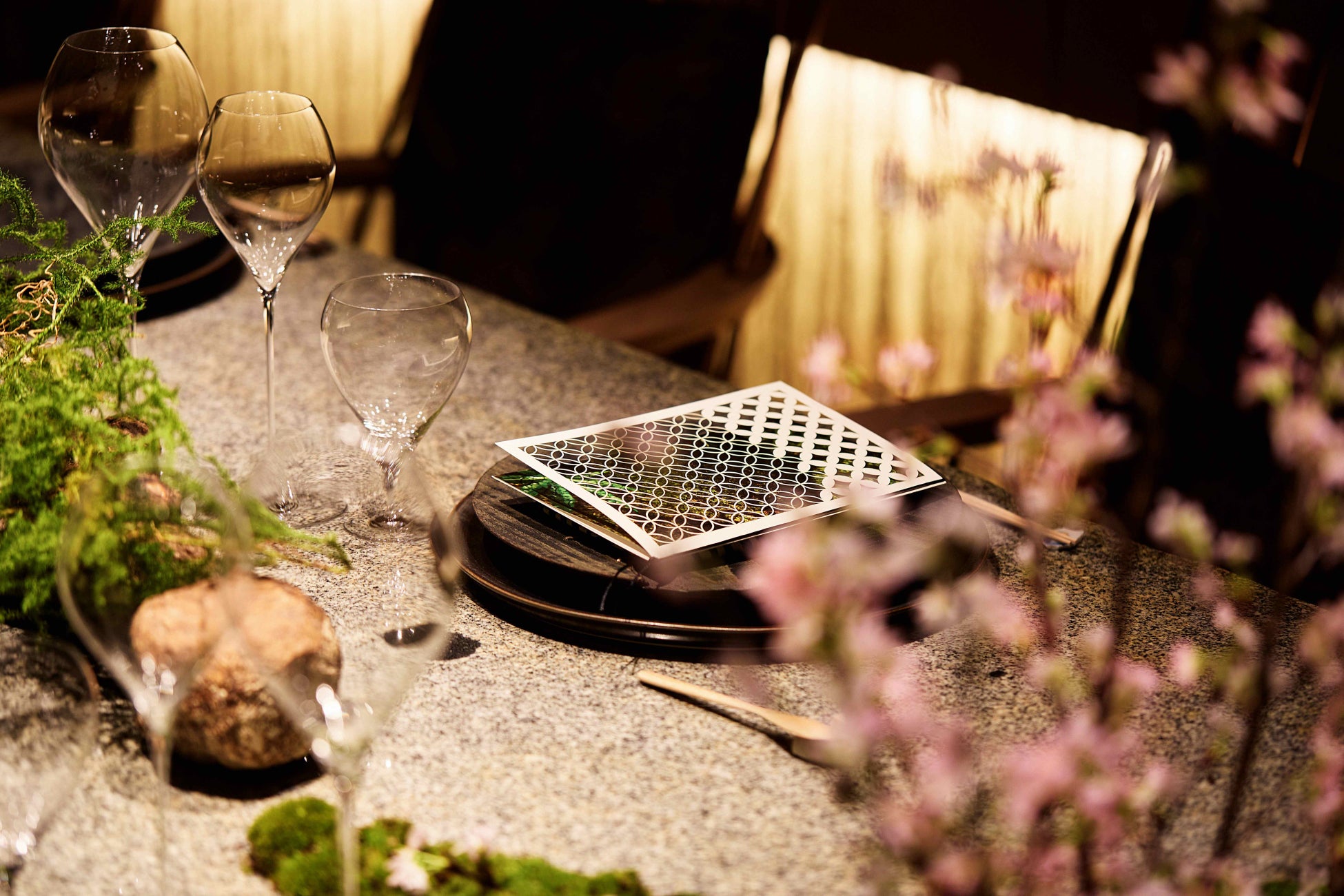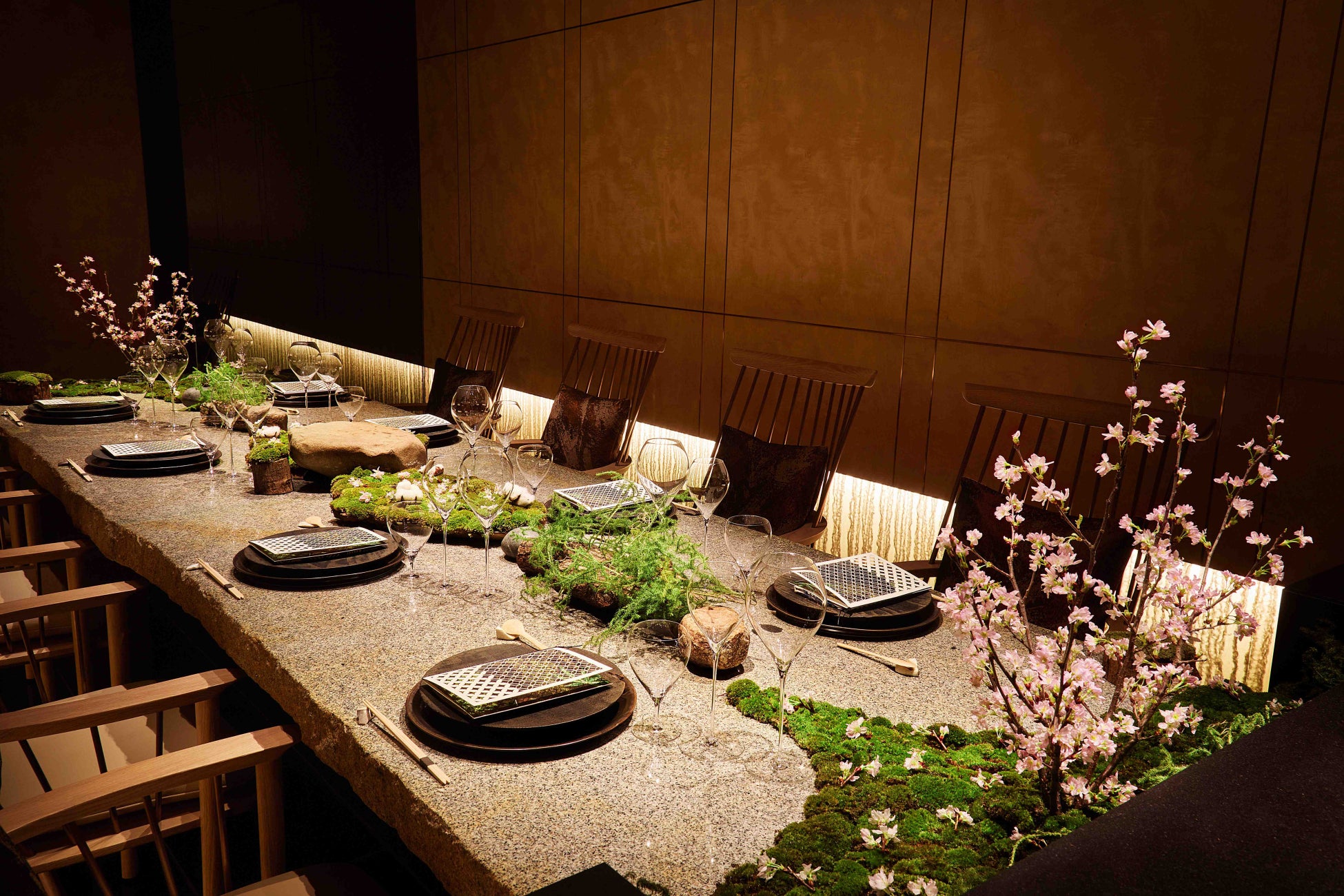 専属の庭師が、庭を手入れするようにテーブルコーディネートを担い、自然の雄大な音色の中で味覚や嗅覚を刺激する食材の味わいを最大限に引き出したお料理で皆様をお迎えする「シェフズ・テーブル by Katsuhito Inoue」は、季節の巡りを感じていただけるよう、桜の装飾で華やかに彩られた、春の訪れを感じさせる優雅な空間に。咲き誇る桜の美しさに加え、京都の「七十二侯」をテーマに旬の食材を調理したお料理から香りや味わい、心地よい春の空気を五感で感じる没入感あふれる特別なひとときをご提供いたします。