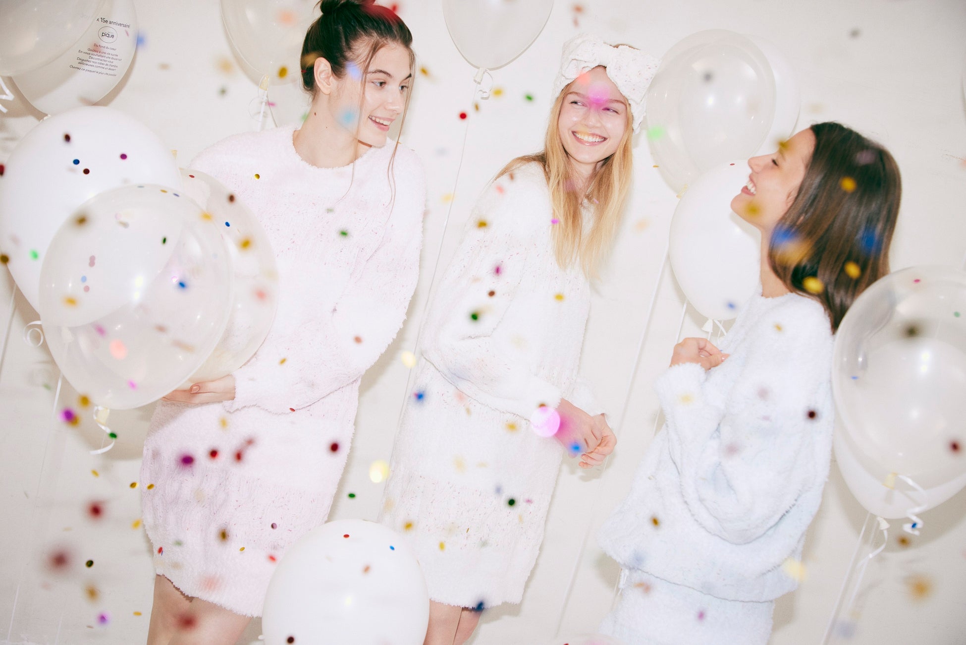 カラースプレーを散りばめたようなカラフルなニットや、15周年オリジナルベアのぬいぐるみもラインアップ