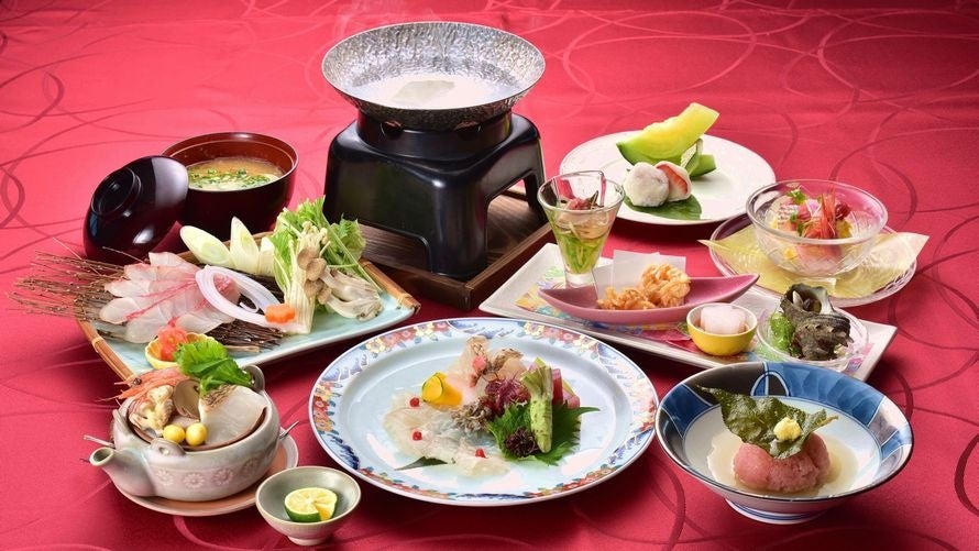 和食会席では、前菜でさくら海老の摘まみ揚げや桜豆腐など、吸い物で真鯛の土瓶蒸し、お刺身は真鯛の薄造り、蒸し物として桜饅頭、鍋物では地産の金目鯛のしゃぶしゃぶ、お食事でミニちらしなど春や桜を感じていただけるコースをご用意いたします。