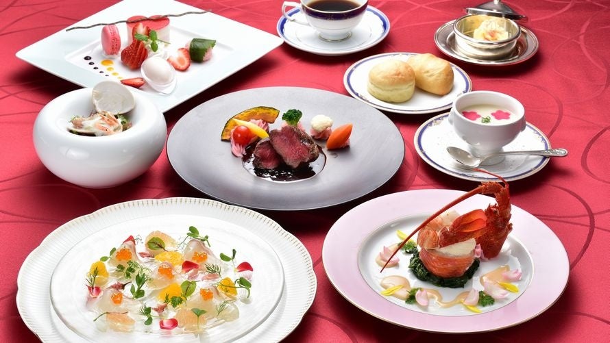 洋食コースでは、オードブルで真鯛の昆布締め 桜の葉マリネ 柑橘ソース桜、スープは桜色のポタージュ・ド・パルマンティエ、魚料理は金目鯛とイセエビのムース 桜のエキス入り白ワインソース、肉料理は桜チップで瞬間スモークした国産牛のグリル トリュフソース。