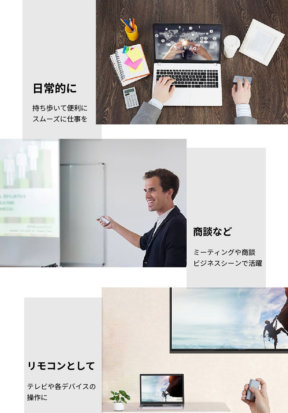 スクロールやクリックなどマウス操作に加えて、レーザーポインターやプレゼンテーション商談時の操作ボタン、また、各デバイス操作のリモコンとして便利にお使いいただけるお役立ち仕様です。