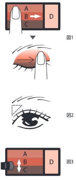 ③ブラシを立てた状態でB・C色を縦に2~3往復してパウダーをブラシに含ませ(図3)眉の形に沿って描きます。