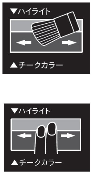 ●指の腹で表面を2~3往復すべらせ、ハイライトとチークカラーを同時に指先にとり、ほお骨に沿ってのばしたあと、ぼかします。