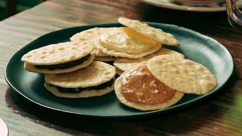 国産の米を使い、薄さ3ミリに焼き上げた煎餅に、風味豊かなクリームをサンド。クリームと煎餅2枚を一緒に食べたときに、パリパリとした香ばしさが引き立つよう、試作を重ねたどり着いたベストバランスの新感覚煎餅です。洋菓子の発想で生まれたくちどけなめらかなクリームを挟み、コーヒー、紅茶にも合います。