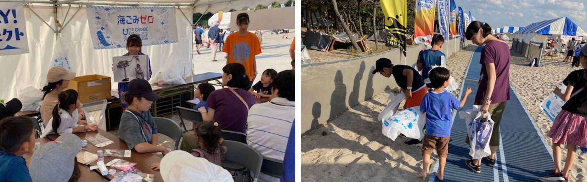 海のイベント会場でファミリーで海洋ごみについて学ぶ
