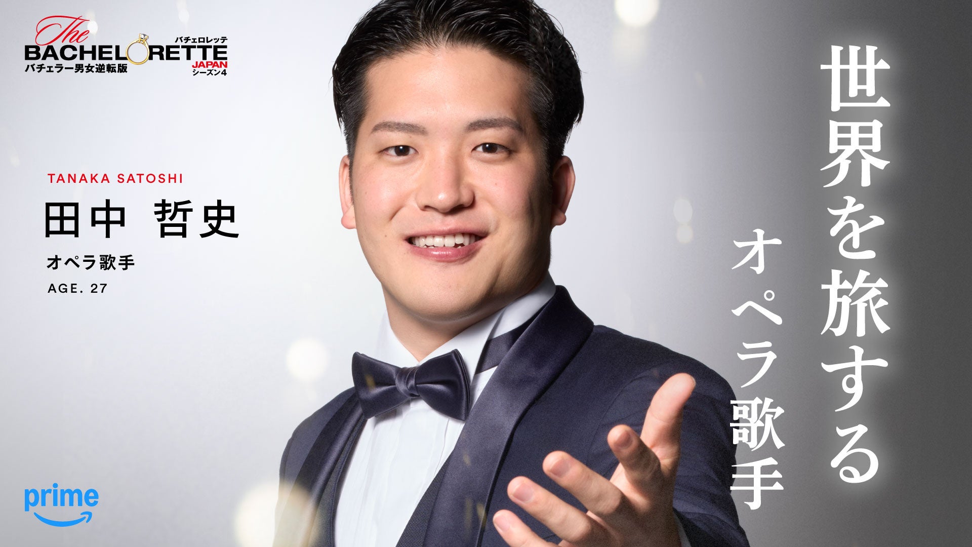 そしてこの度、待望の男性参加者14名が一挙発表となりました。今回の男性参加者は、世界を旅するオペラ歌手、恋の風を読むゴルファー、愛の輪郭を捉えたい彫刻家、恋に臆病な最強レスラーと、多彩で底知れない魅力と熱い想いを併せ持つ顔ぶれが集結。発表に伴いPrime Video公式YouTubeチャンネルにてそれぞれのインタビュー動画も解禁。14通りの自信と覚悟を携えた男性参加者たちが持ち前の武器や“真実の愛”について真剣に語っています。「肉食系になって押して押して押しまくる(櫻井氏)」「素直に自然体で向き合う(山崎氏)」「何も作戦ないです。ライモンのままだけで十分やと思う(ライモン氏)」など、平松氏への積極的なアプローチにも期待が高まります。