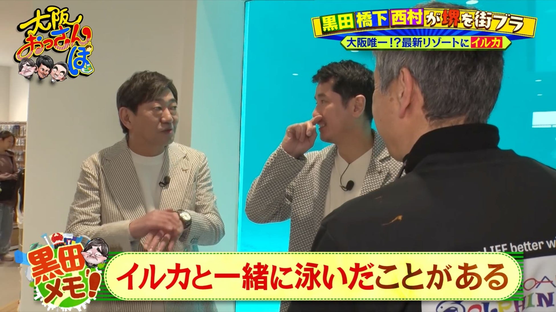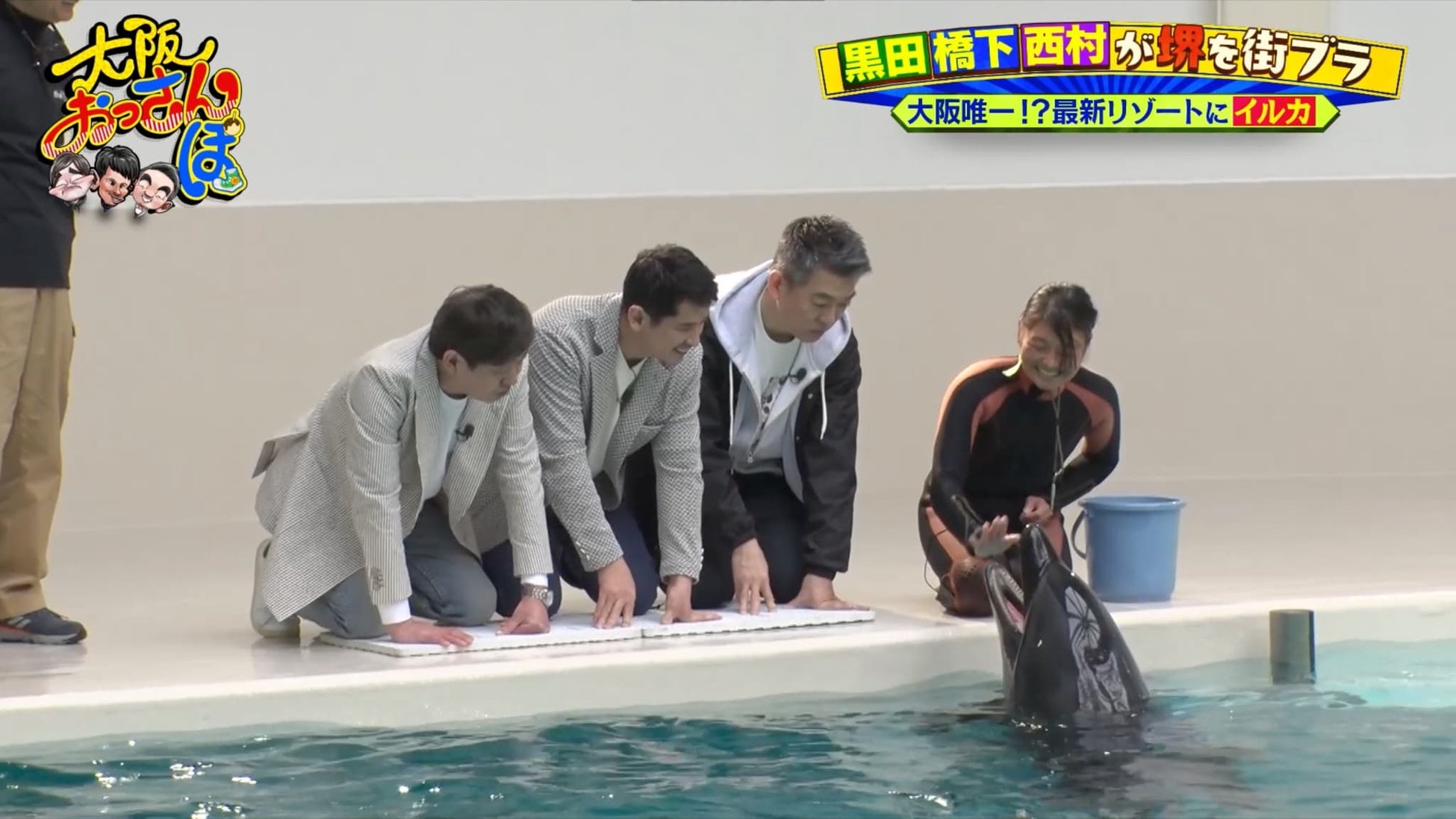 続いて訪れたのは、今年3月にオープンしたイルカのふれあい施設「ノア ドルフィンドーム」。「堺にイルカがおるの!?」と驚きつつ一行はさっそく中へ。黒田は以前、番組のロケでイルカと泳いだことがあるそうで、イルカの手触りを「ナスビに似てる」と主張する。