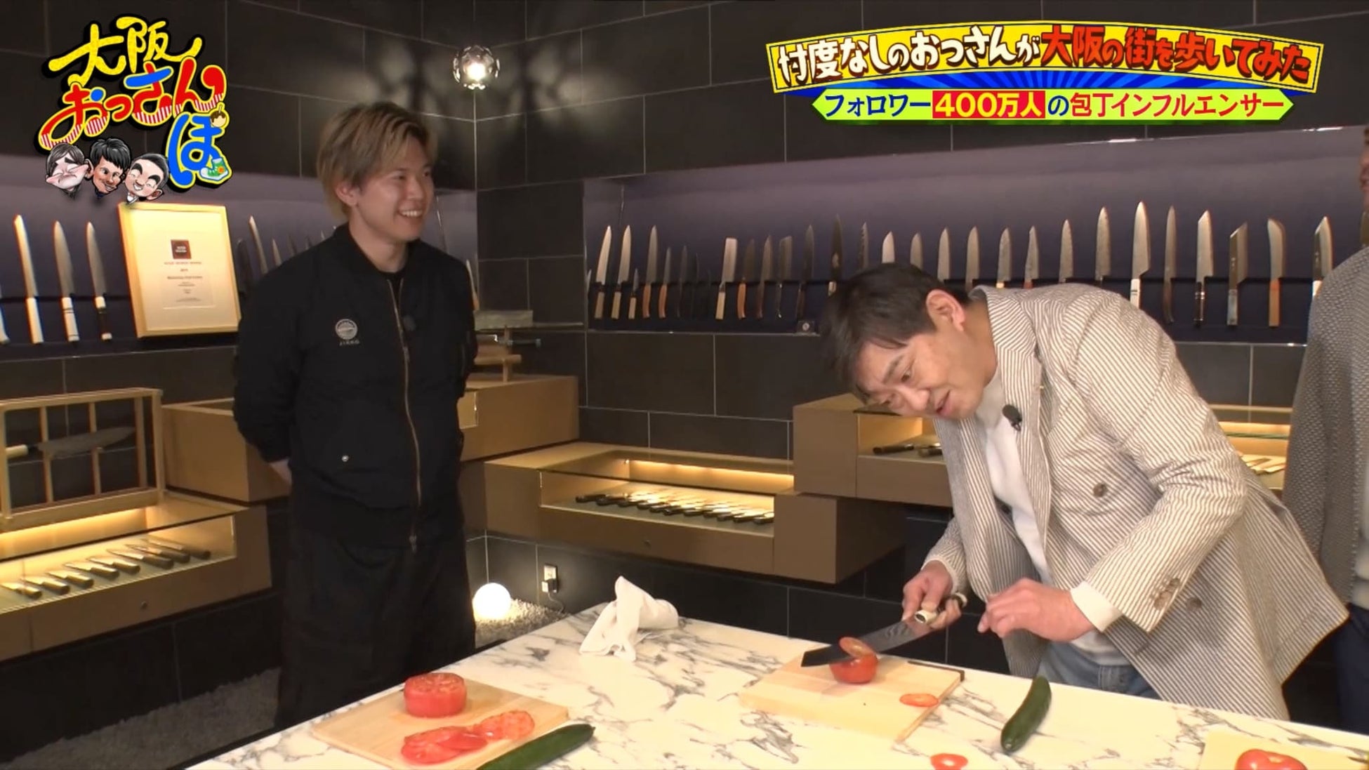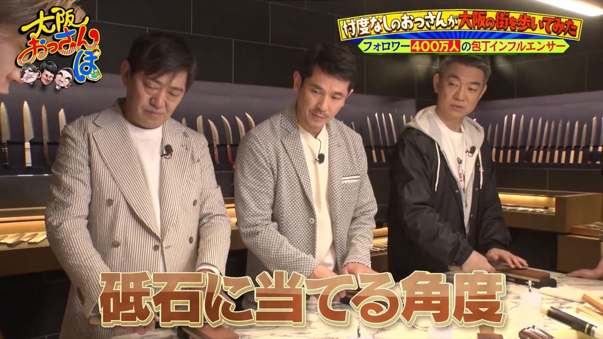 「實光刃物」のインバウンド客から人気に火がついたきっかけが、研師のRyotaさんの存在。包丁の研ぎ直しのビフォーアフター動画がSNSでバズり、動画を見た海外の人々がわざわざ店に訪れるほどの“包丁インフルエンサー”なのだ。そこで、おっさんたちもRyotaさんに正しい包丁の研ぎ方を教わることに。