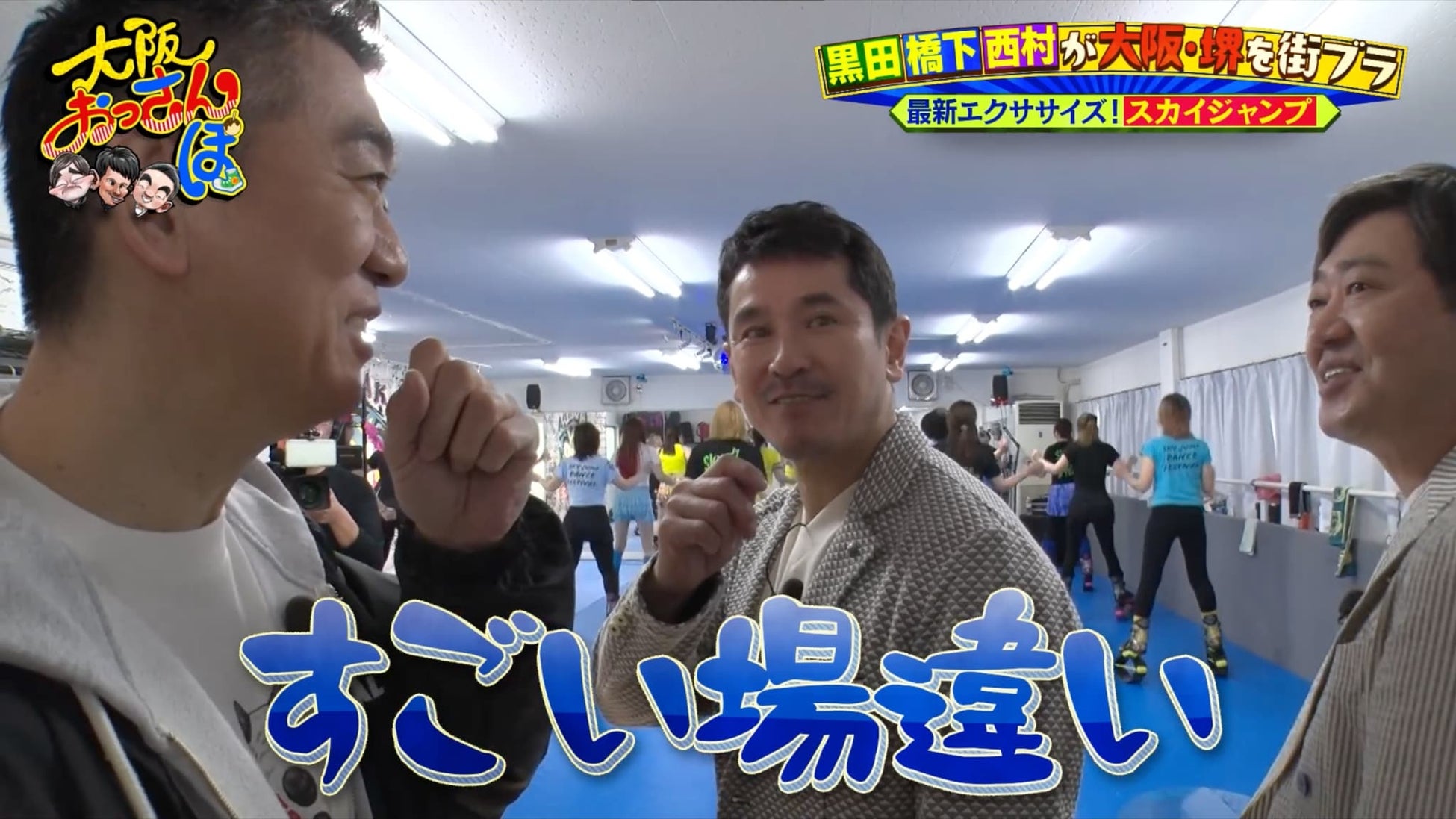 次に訪れたのは、「SKY JUMP OSAKA」。ここはドクター中松のジャンプシューズに着想を得たという最新エクササイズが体験できるスタジオで、フロアに入ると大勢の女性たちがエクササイズの真っ最中。「イェーイ!」というハイテンションな掛け声に、おっさんたちは「すごい場違い…」とタジタジ。