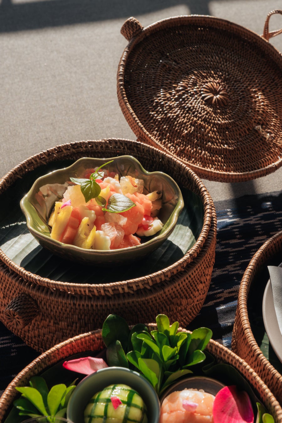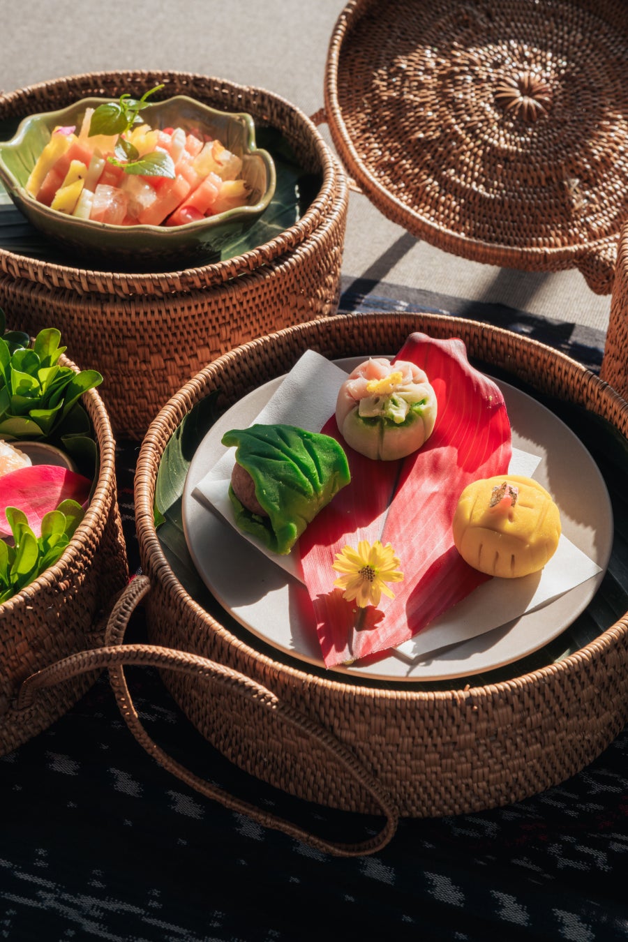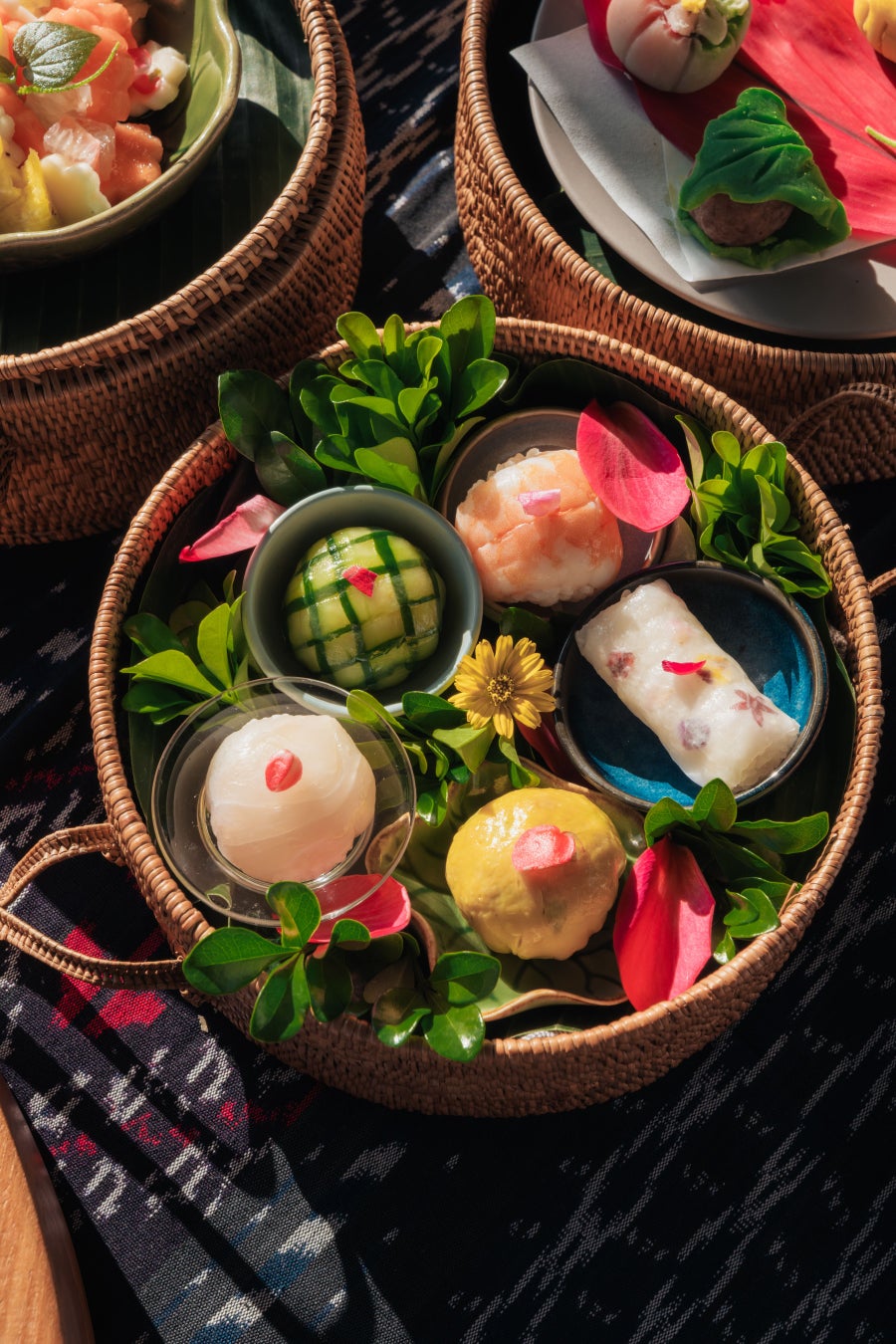 農作業など仕事の休憩や、ピクニック、隣人や家族と食事を分かち合う際に用いられてきた、19世紀から伝わるインドネシア伝統の弁当箱「ランタン」。使い捨てでなく再利用できる点でもエコフレンドリーな容器として再注目されています(*5、*6)。バリ・ヒンドゥーの人々が大切に受け継ぐ、「神・人間・自然」の三者間の調和を保つことが、人々の幸福と世界の繁栄をもたらす根本的な道徳的基盤であるという思想「トリヒタカラナ」(*7)。この考え方を伝統の3段重ねの弁当箱に、3種類の料理で表現しました。ナシゴレンなどインドネシア料理を取り入れた「てまり寿司」、バリの花を象った練り切りのデザートなど、バリやインドネシアの食材、風味と、日本の調理技法が融合した、ピクニックスタイルのランチメニューを、カフェ・ガゼボにて提供します。