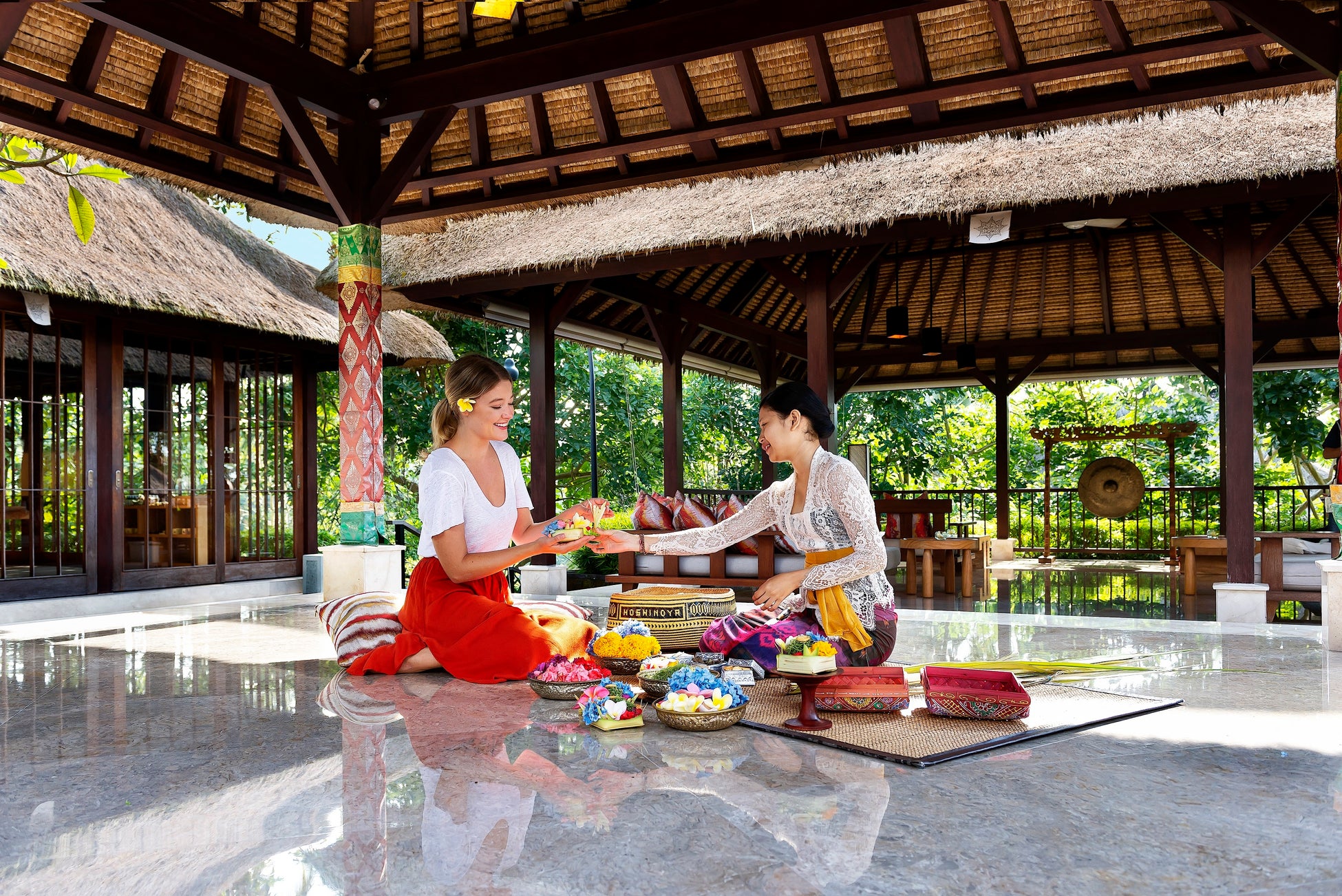 リゾート内では、バリの文化を学ぶことができる様々なアクティビティを用意しています。朝の清々しい空気の中、近隣のライスフィールドやバンジャール(集落)をスタッフの案内とともに散策したり、バリ・ヒンドゥーが毎朝お寺に捧げる、カラフルな花を用いたお供え物「チャナン」や、インドネシアのろうけつ染め「バティック」を作ったりする体験は、お子様のいるご家族にも人気です。よりじっくりとバリの文化を体験したい方には、「バリ舞踊レッスン」や、「バリのマーケットツアーと伝統料理クッキングクラス」(ともに要予約・有料)もおすすめです。