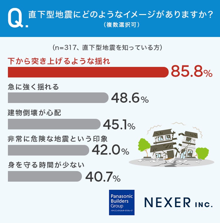直下型地震については、「下から突き上げるような揺れ」というイメージが最も多く、突発的で強烈な揺れを想像する人が多い結果となりました。