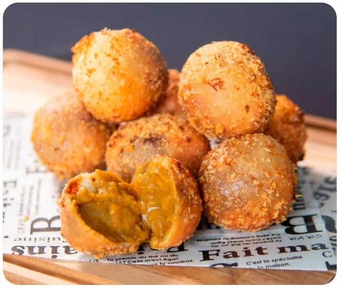 “彼”と“カレー”を掛けて、いつもそばにカレーパンがある幸せをイメージしながら命名。お店の看 板メニューは、日本カレーパン協会主催の『カレーパングランプリ』にて2年連続金賞に輝いた “ひとくちカレーパン”。じっくり煮込んだ野菜に独自のスパイスを配合し、成形時にさらに野菜ピューレを練り込むことで、絶妙な辛みと甘みのバランスを実現しました。カップ入りで持ち運びしやすく、シェアして楽しめるのも魅力。