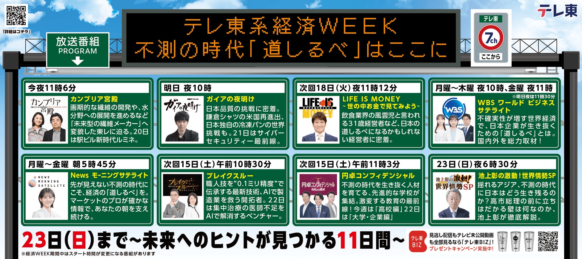 テレ東では、11月13日(木)〜23日(日)の11日間、全経済番組が同一のテーマを扱い経済番組を盛り上げる、「テレ東系経済WEEK」を実施いたします!今回で5回目を迎える「テレ東系経済WEEK」のテーマは、『不測の時代「道しるべ」はここに~未来へのヒントが見つかる11日間~』です。終わりの見えない戦乱に加え、トランプ米大統領の登場で、これまで以上に予測不能な時代が訪れています。日本の政治や経済の枠組みも大きな変革期を迎えている今、ビジネスの世界で生き残るための「道しるべ」はどこにあるのでしょうか。今年の経済WEEKでは、未来を指し示すヒントになるようなコンテンツをお届けします。