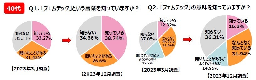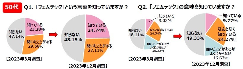 40代では「フェムテック」という言葉を「知らない」と答えた人の割合は前回調査からほぼ変わらないものの、「聞いたことがある」という回答が約5%減少し、その分「知っている」という回答が増加しました。また意味 を「聞いたことがあるがよくわからない」と答えた人が約4%減少し「知っている」という回答が増加していることから、「フェムテック」へ興味を持った人が、より知識を深めていった傾向があります。