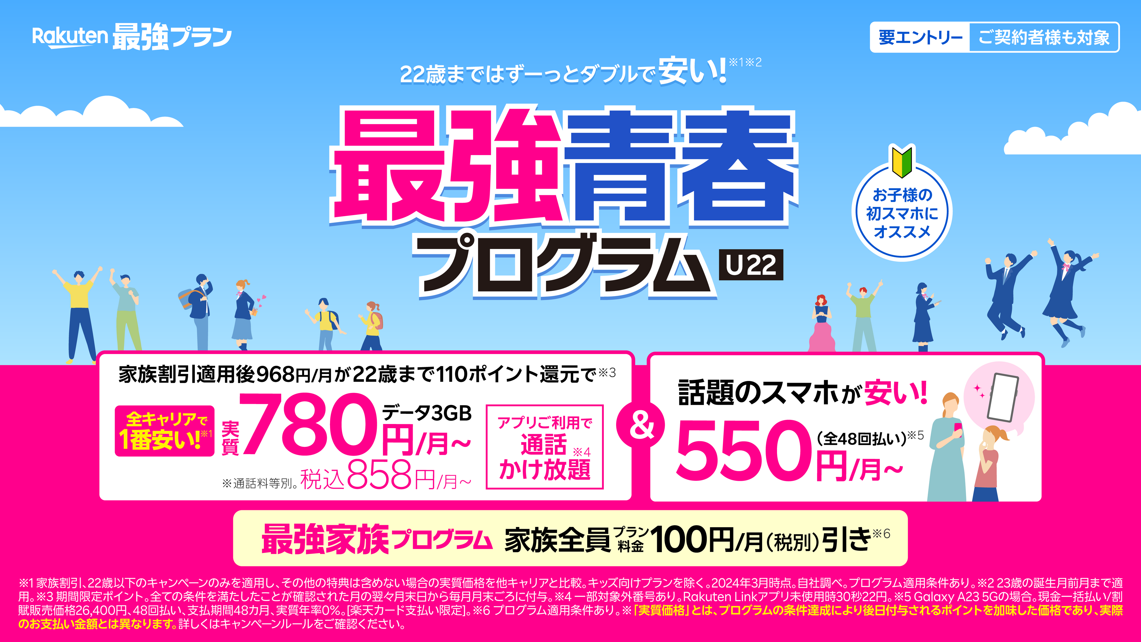 楽天モバイル、22歳までずっとおトクに利用できる「最強青春プログラム」を開始
