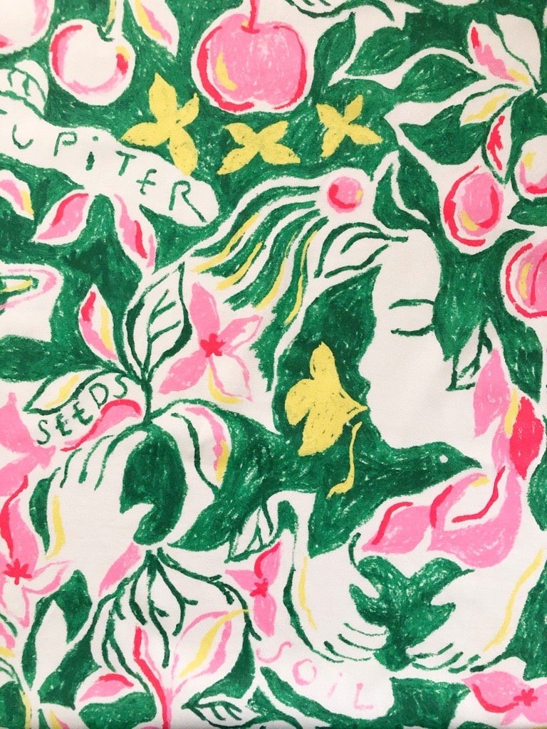 「ピースフルなメッセージをテキスタイル にのせて贈る」をコンセプトに、手描きの自由で伸びやかなドローイングをプリントした布が特徴です。デザイナーである櫻井マナミ氏が、手刺繍を加える事で優しく柔らかな心地に包まれる様なテキスタイルを製作しています。