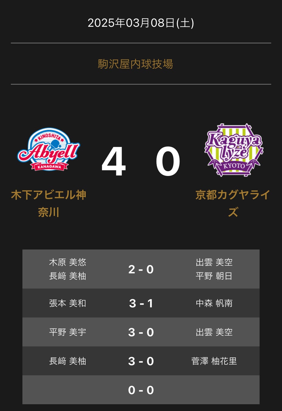 ノジマTリーグ 2024-2025 公式戦 3月8日開催 木下アビエル神奈川 vs 京都カグヤライズ の試合は、4-0で木下アビエル神奈川が勝利しました。
