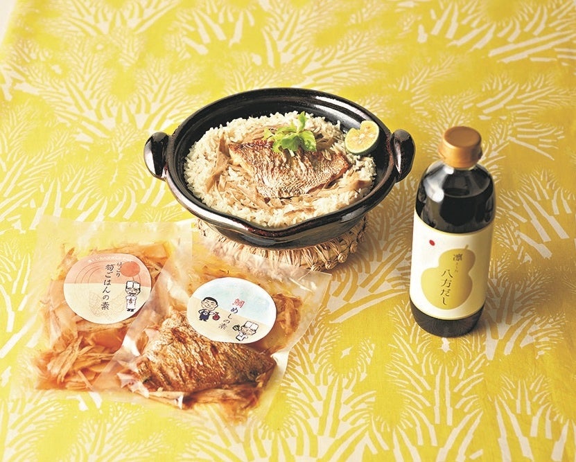 砂糖・塩を使わず、昆布・ 油・みりん・酒のシンプルかつ独自の配合で仕上げた「八方だし」。このだしを使用し、旬素材を家庭で簡単に味わっていただくため、神経〆めした真鯛と筍の「炊き込みご飯の素」もご紹介します。