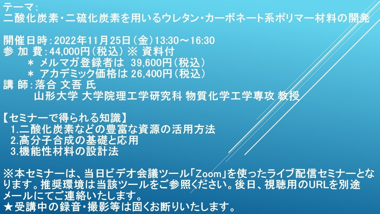 先端技術情報や市場情報を提供している(株)シーエムシー・リサーチ(千代田区神田錦町: https://cmcre.com/ )では、 各種材料・化学品などの市場動向・技術動向のセミナーや書籍発行を行っておりますが、 このたび「二酸化炭素・二硫化炭素を用いるウレタン・カーボネート系ポリマー材料の開発」と題するセミナーを、 講師に落合 文吾 氏 山形大学 大学院理工学研究科 物質化学工学専攻 教授)をお迎えし、2022年11月25日(金)13:30より、 ZOOMを利用したライブ配信で開催いたします。 受講料は、 一般:44,000円(税込)、 弊社メルマガ会員:39,600円(税込)、 アカデミック価格は26,400円(税込)となっております(資料付)。