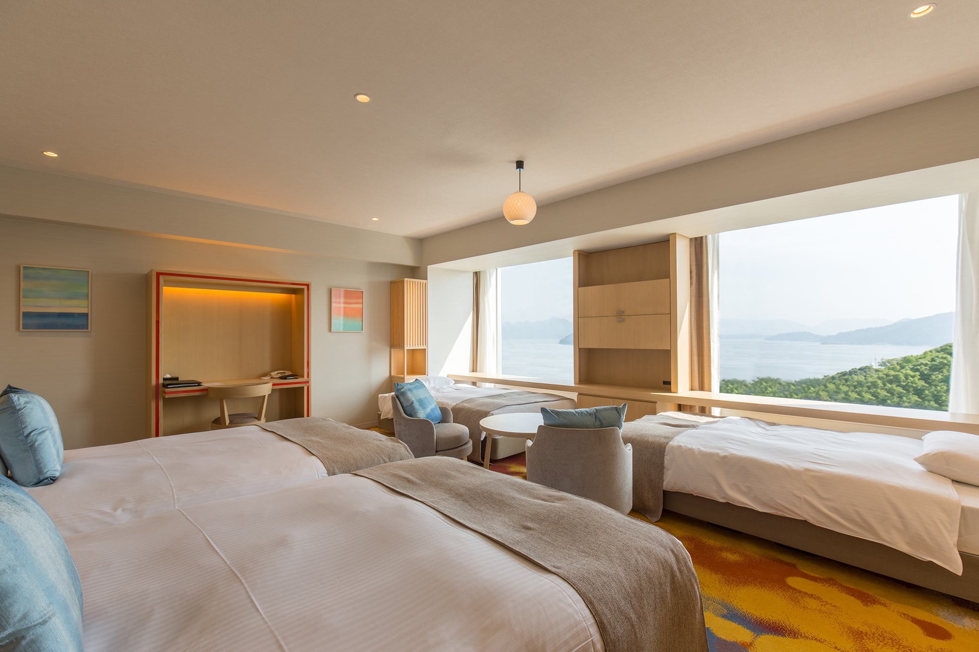 コンセプトは「広島 瀬戸内海×至福のハーモニー」。海辺の解放感と一体感を活かし、ふりそそぐ太陽の光や移りゆく時間とともに表情を変える瀬戸内海をモチーフにしたデザインです。広々としたお部屋で、グループでのご宿泊にもおすすめです。