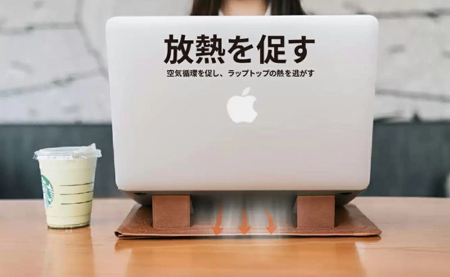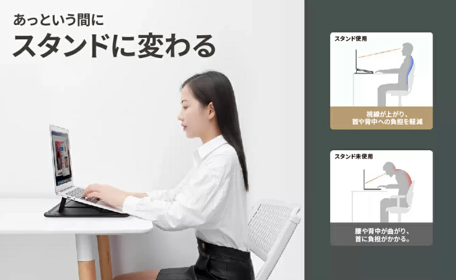 ラップトップスタンドを使用することで首や背中への負担を無くし、より快適にご利用いただけます。