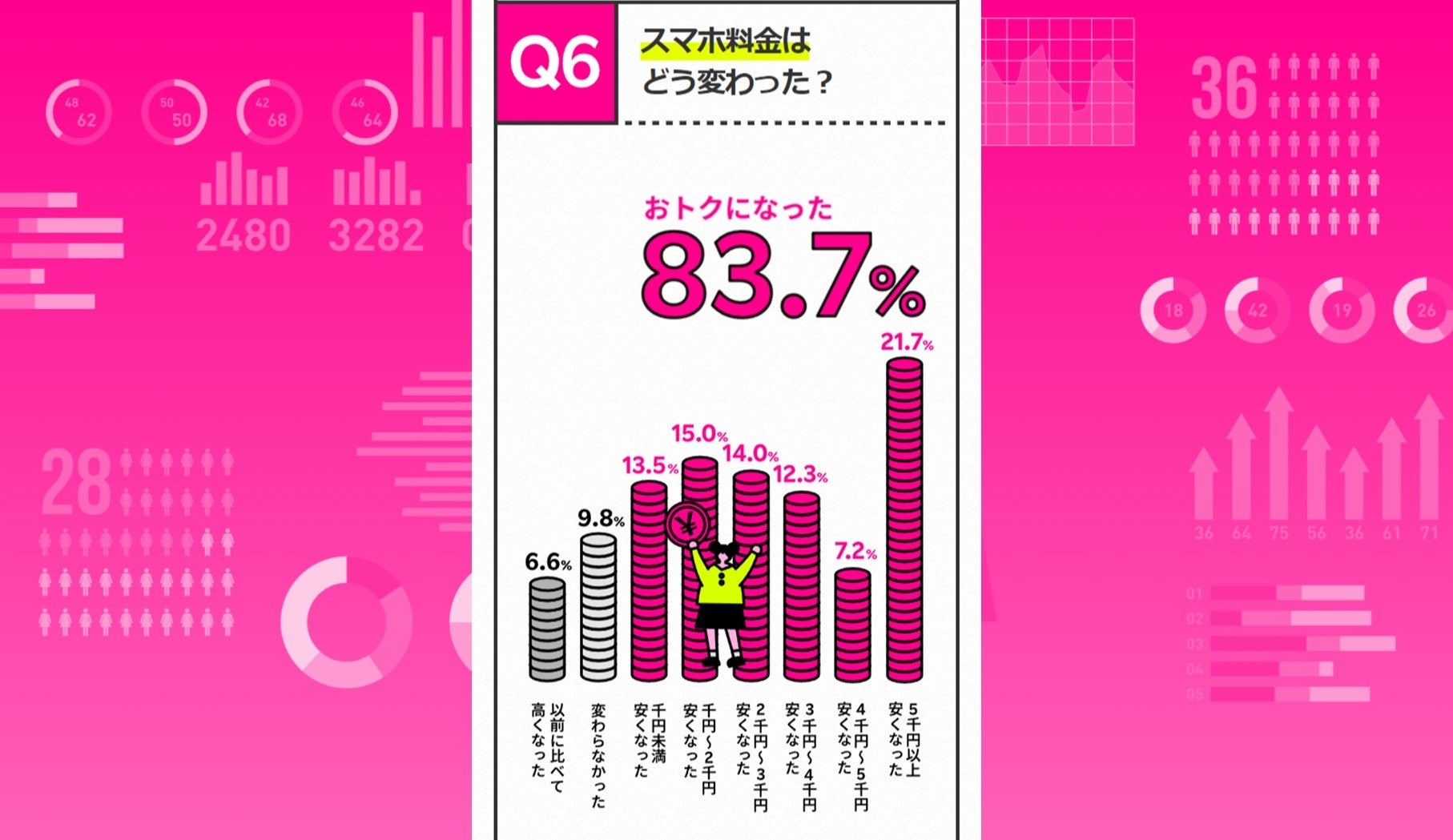 「以前契約していたスマホ通信会社に比べて、携帯料金はどのように変化したか」と伺ったところ83.7%の方が契約前よりもおトクになったと回答いただきました。さらに、大手3キャリアから乗り換えた人の中で、以前契約していた通信会社に比べて、91.4%の方が「安くなった」と回答。そのうち33.8%の方が「5,000円以上安くなった」と回答しています。