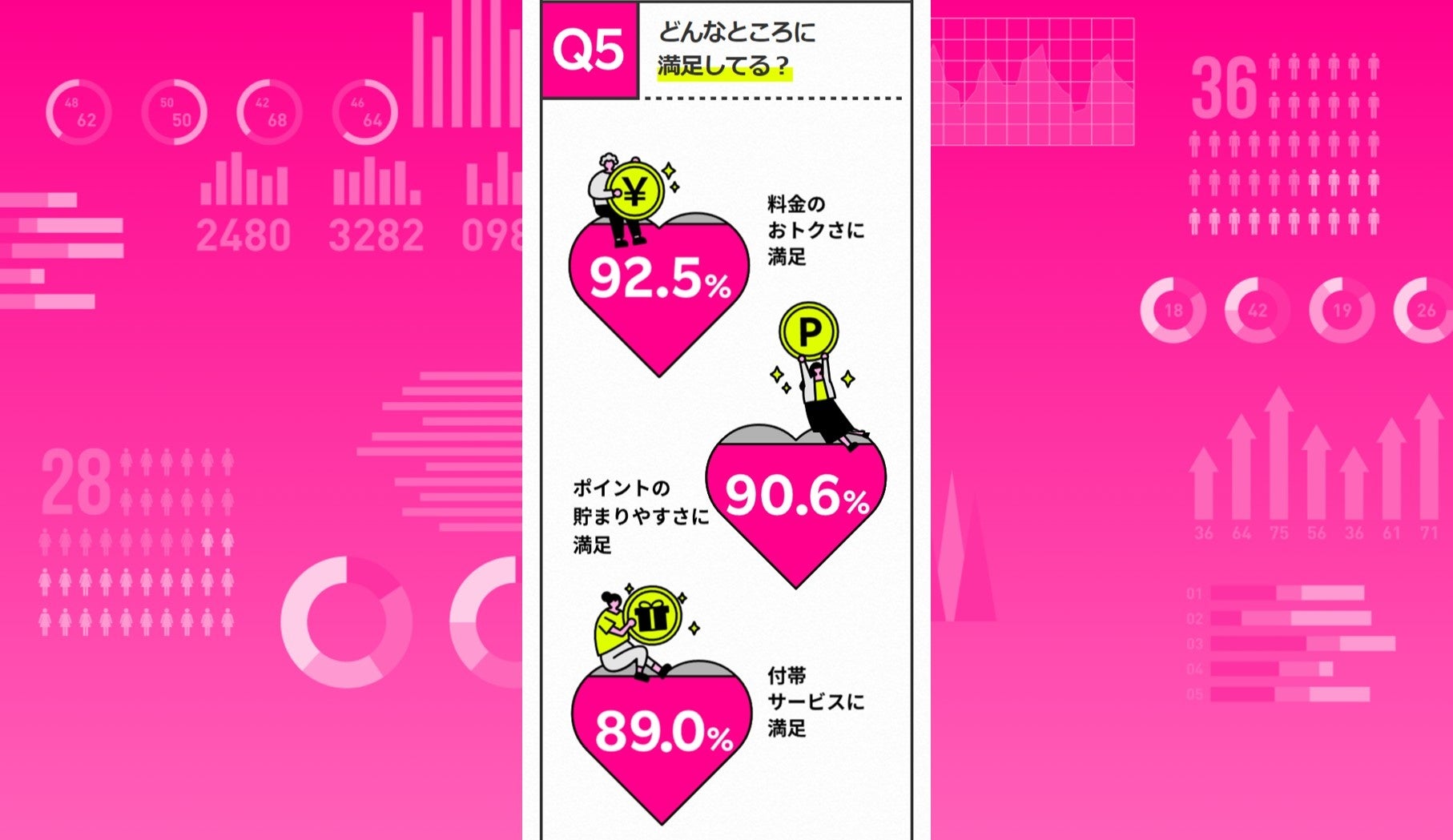 「楽天モバイルに対するそれぞれの項目に対する満足度」を伺ったところ、92.5%の方が「料金のおトクさに満足している」と一番多くの回答いただきました。また、90.6%の方が「ポイントのたまりやすさ」に満足いただけており、「付帯サービス」でも89%の方に満足いただけているという結果となりました。