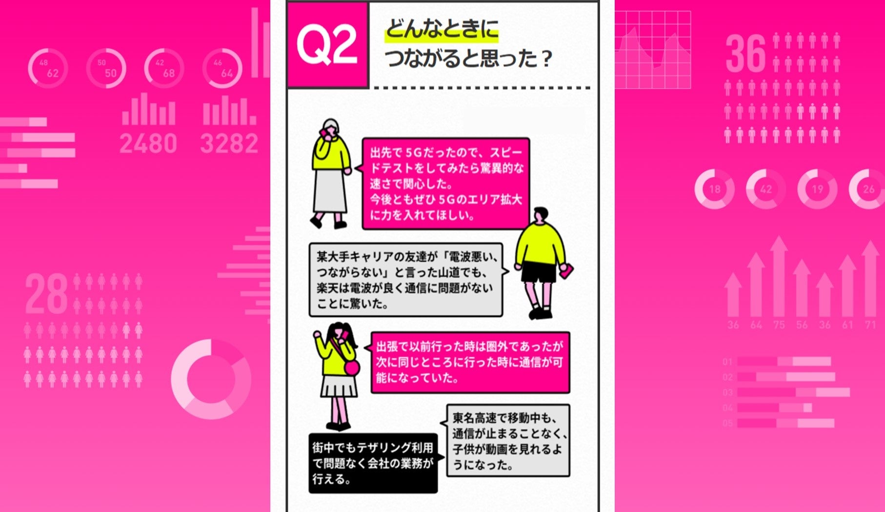 また、「楽天モバイルを利用しているなかで、ご契約した当初より電波がよくなったと感じた、シーンや場面」を伺う質問では、「街中でもテザリング利用で問題なく会社の業務が行える」や「出張で以前行った時は圏外であったが次に同じところに行った時に通信が可能になっていた」という声を多くいただきました(注4)。