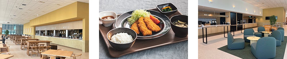 ▼【ダイニング(社員食堂)・カフェ】毎朝、昆布とかつおで取った出汁から作るおみそ汁や、かまどで炊いたつやつやごはんを食べることができます。カフェでは、ふわふわの泡のカフェラテやジェラートも。